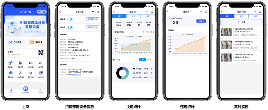 具有实时监控、违规统计、投递统计、设备管控、在线报修、在线对话等功能。