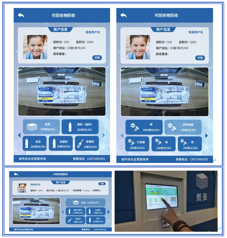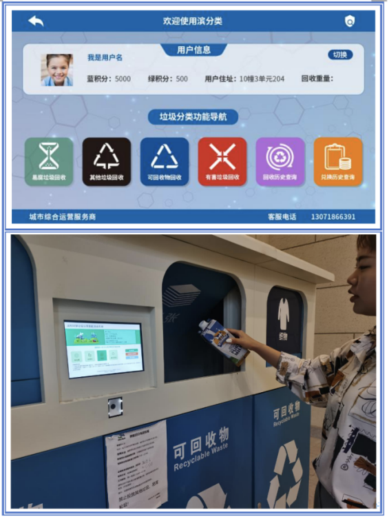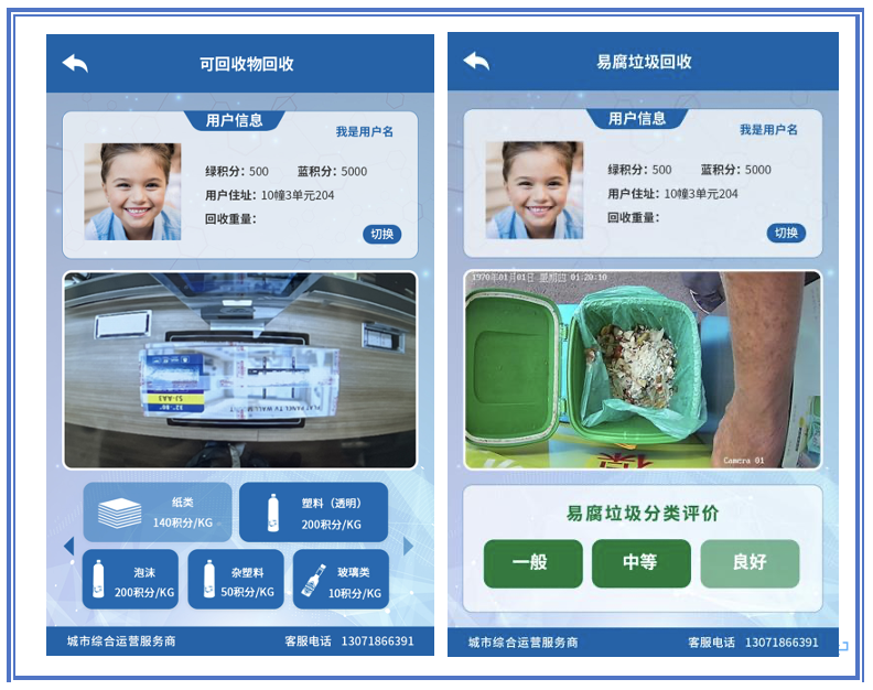 使用智能设备时,设备会将易腐垃圾进行称重、评分、拍照,会对居民分类投放的垃圾评定等级,以优秀、良好、一般三个等级进行评定,完成后居民二维码卡内可计入积分。同样,还能实现其他垃圾、可回收物、有害垃圾的称重、拍照和评价。