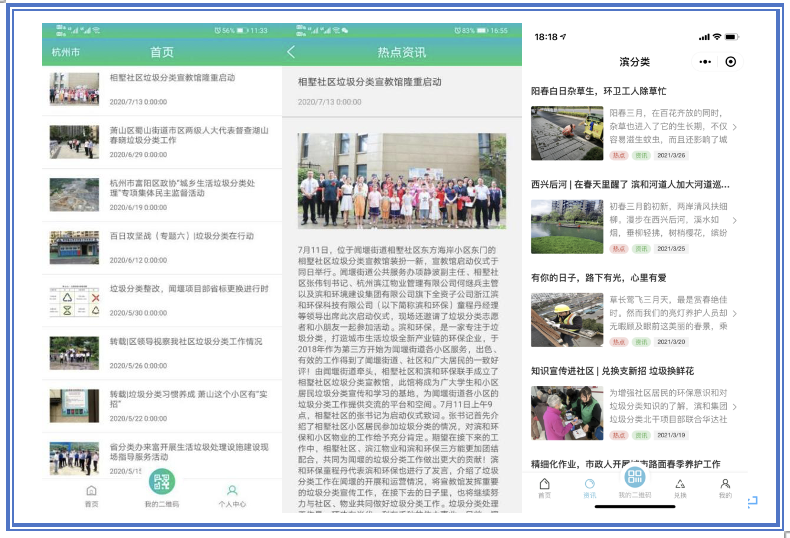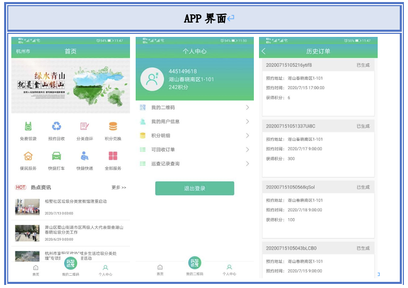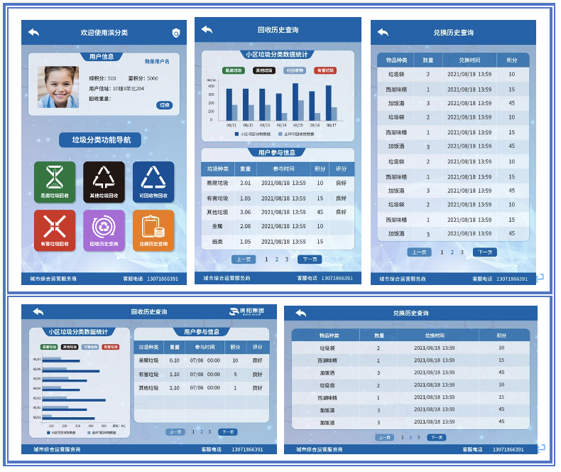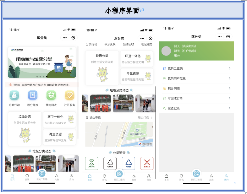 居民可通过应用商城下载或微信小程序内获得,APP和小程序内设有垃圾分类宣传、垃圾分类小知识、企业动态、积分兑换商品明细及对应积分、二维码卡内积分余额、二维码、可回收物投放对应积分、大件垃圾上门预约服务等,方便居民在小区内进行垃圾分类。