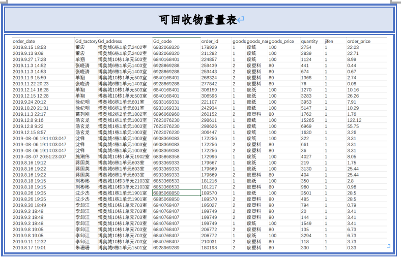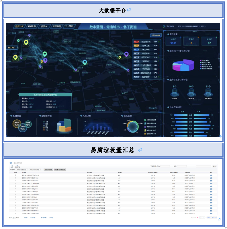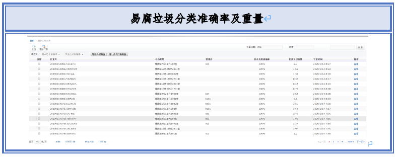 可在大数据平台上显示查看每个小区的每日产生的易腐垃圾、其他垃圾、可回收物、有害垃圾的信息,包括投放行为、投放种类、投放量等,并累计数据信息,便于日后查询、统计等。