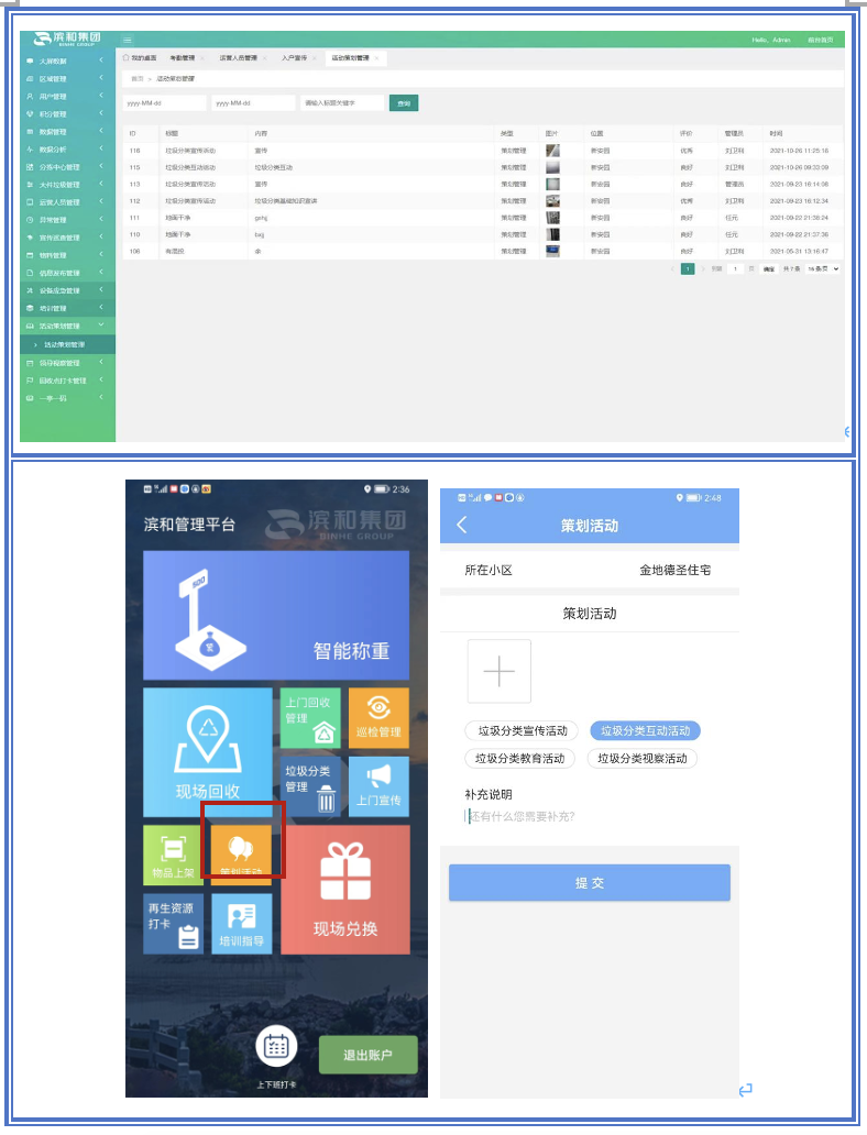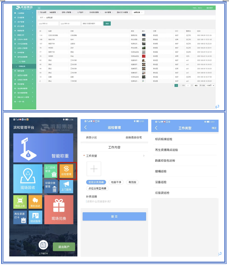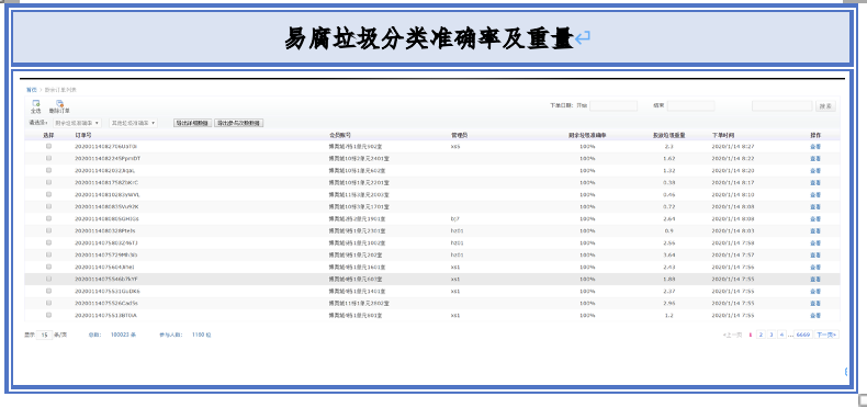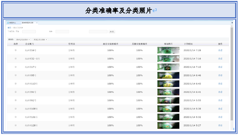 居民投放的易腐垃圾、可回收物将通过智能称重设备,记录居民投放行为、投放种类及投放量,并且工作人员可对易腐垃圾拍照打分,上传分类准确率。并且工作人员与移动终端设备是一对一匹配,不存在窜改、上传有误等情况产生。通过对小区内垃圾分类投放的准确率、重量管理,可体现小区内垃圾分类工作质量。