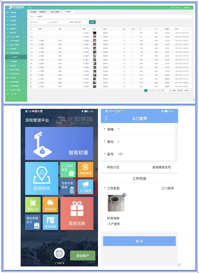 入户宣传包括上门入户宣传情况拍照、位置(小区、幢、单元、室)、工作评价等。后台管理员可通过照片及位置信息判断是否已进行过入户宣传及宣传效果等。