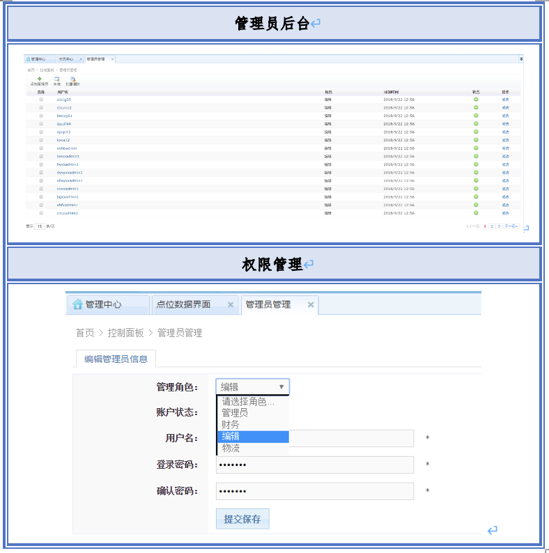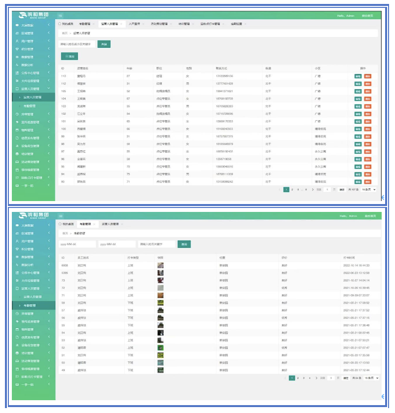 系统后台可录入统计所有项目上工作人员信息,包括年龄、职位、性别、联系方式、所在区域等,管理员可对人员进行增减及赋予后台操作权限。手机端APP也可以进行相同操作。可统计工作人员上下班情况,包括打卡类型、打卡拍照、位置、打卡时间等,且可以选择固定时间段及具体人员进行查询。